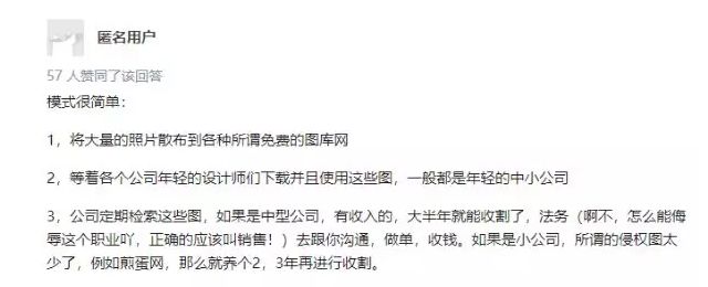 把版權圖片發去網上,然后等到別人無意間使用時,直接上門索賠,而且賠款基本是五萬十萬起。索賠這個方式,比一張張賣圖片,來錢快太多了。