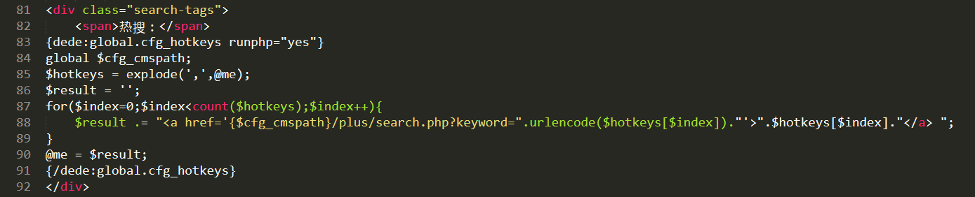 $result .= "<a href='{$cfg_cmspath}/plus/search.php?keyword=".urlencode($hotkeys[$index])."'>".$hotkeys[$index]."</a> ";