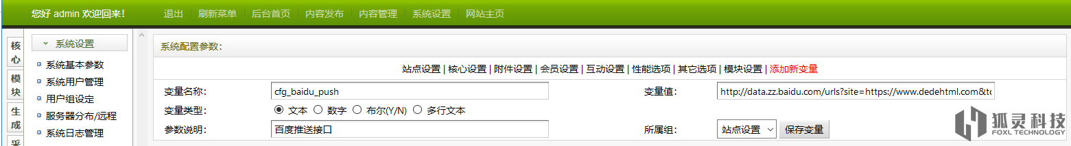 1、織夢網站后臺-系統-基本參數,添加新變量,如果變量值未填寫或者為空將不推送