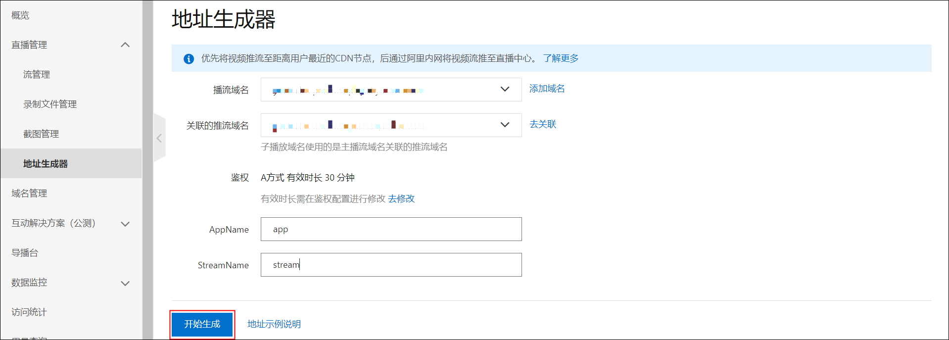 以上推流地址示例由推流域名、AppName、StreamName和鑒權串組成,您需要根據實際情況,替換成您自己的AppName、StreamName和相應的鑒權串。