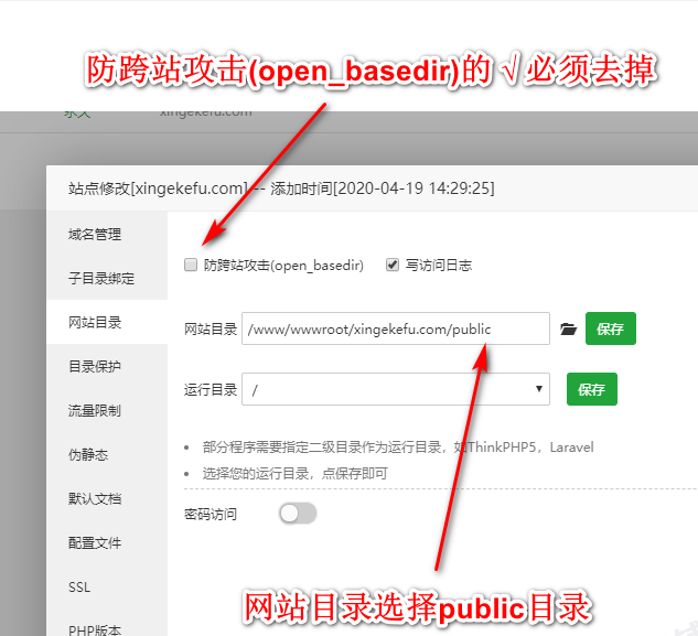 然后點(diǎn)擊網(wǎng)站 設(shè)置 防跨站攻擊取消勾選 網(wǎng)站運(yùn)行目錄選擇public