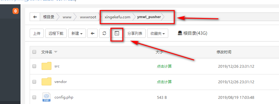 如果沒有出現(xiàn)上圖,一般是由于寶塔版本不同導(dǎo)致初始目錄不同,需要先手動切換到\ymwl_pusher目錄下。